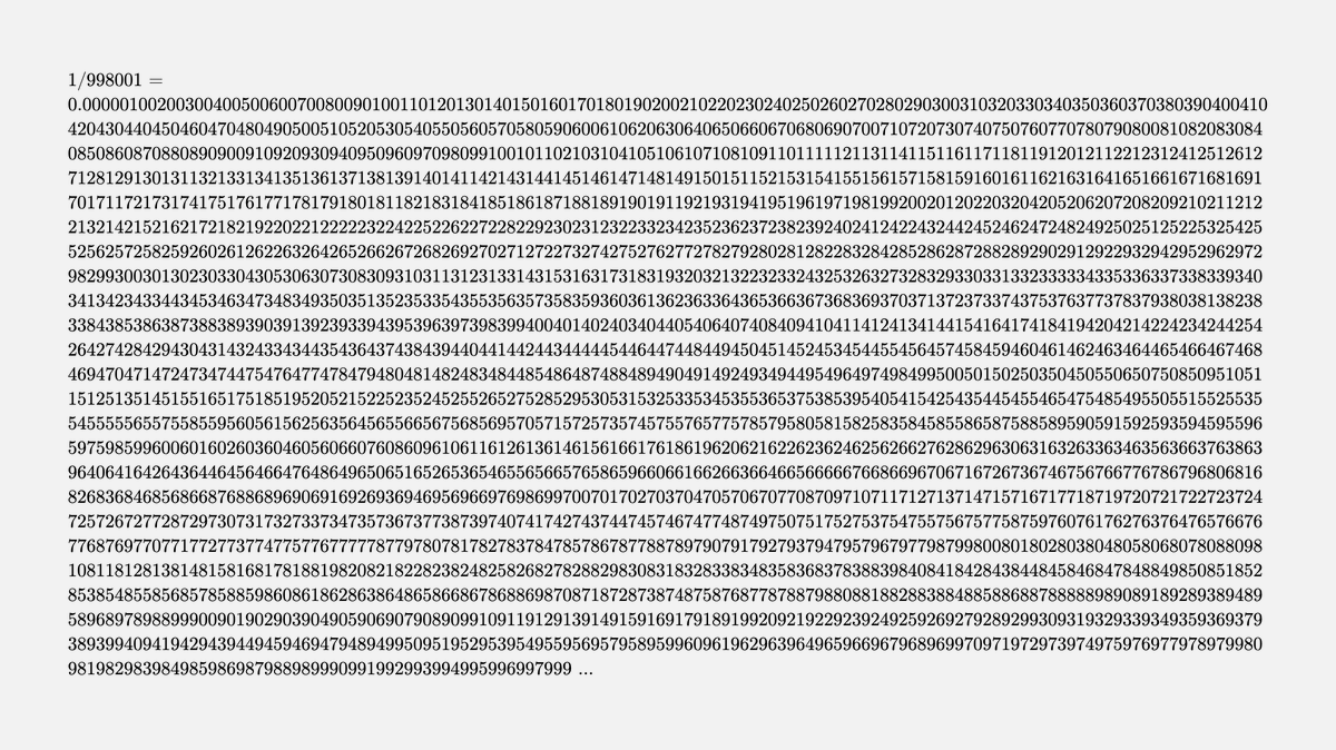 RT @fermatslibrary: 1/998001 has all 3-digit numbers from 000 to 999 in order, except for 998