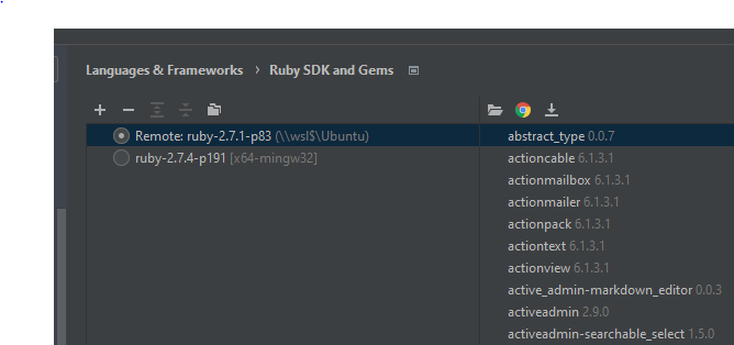 Rubymine, on my windows machine, using ruby from its ubuntu subsytem via wsl…